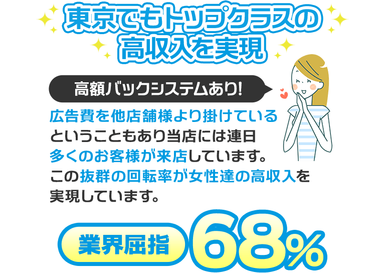 勤務時間にもよりますが稼ぐ子で日給10万以上の子も毎日たくさんいます。一番稼ぐ子で15万ぐらいです。1人もお客様がつかなかったことなどはここ数年ありませんのでご安心ください。身長160cm以上の女性が特に稼げてます!